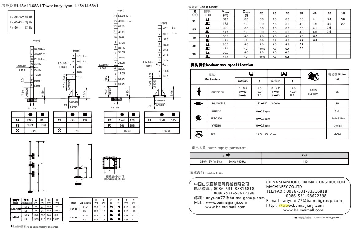 動(dòng)臂式塔式起重機(jī),50米臂長(zhǎng),最大吊重量12噸,水平吊重3噸,可做內(nèi)爬